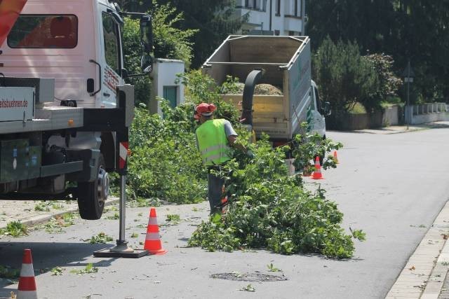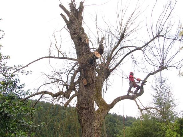 Mittels der Seilklettertechnik oder einer Hubarbeitsbühne werden Stammteile und Astwerk vorsichtig und zielgenau aus dem Baum abgelassen.